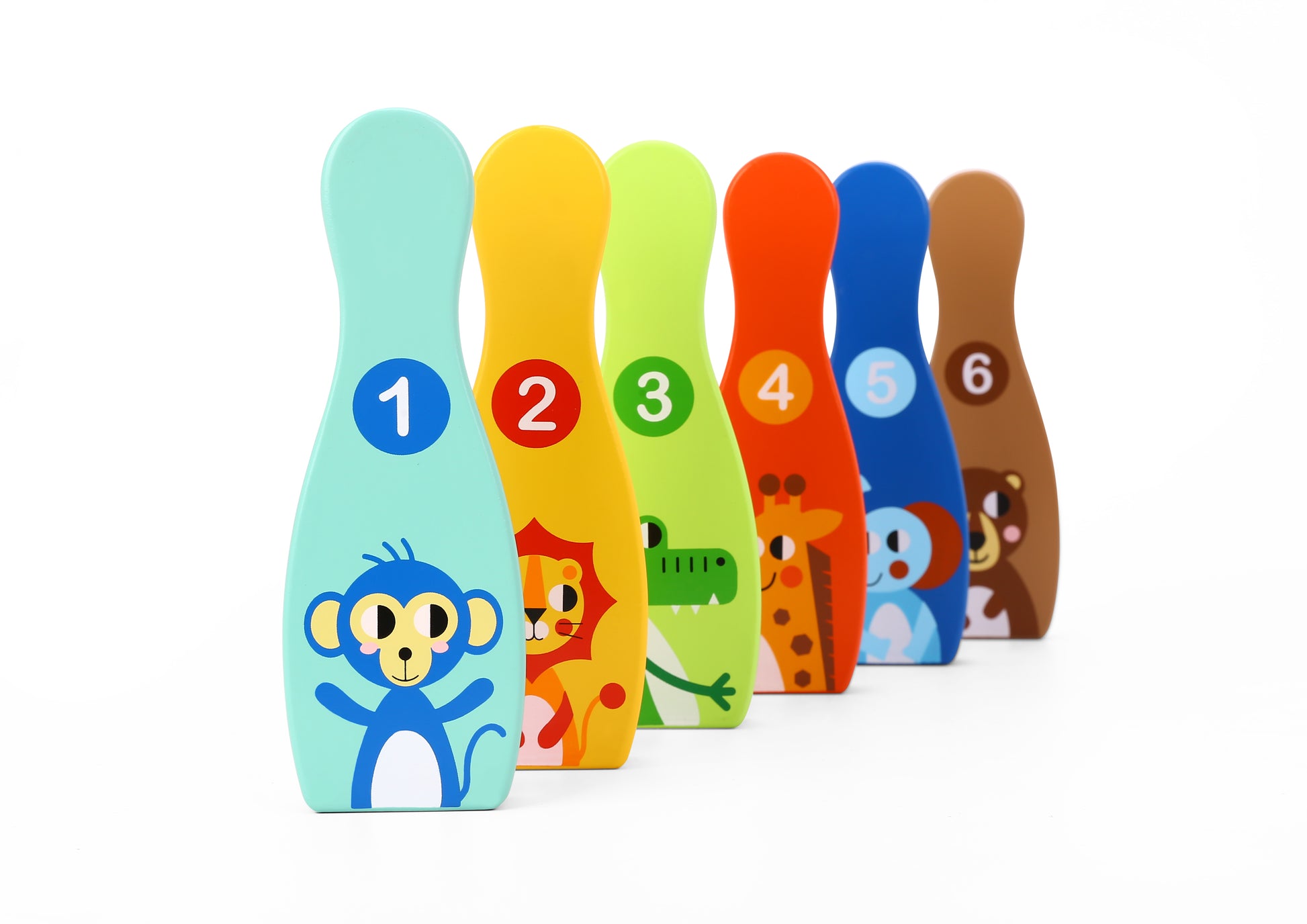 The bowling set (7 pcs) for kids was made of high quality Wood,the surface is coated with water-based paint,Non-toxic and 100% safe for kids, smooth and easy to clean,can be safely in contact with the baby`s skin.