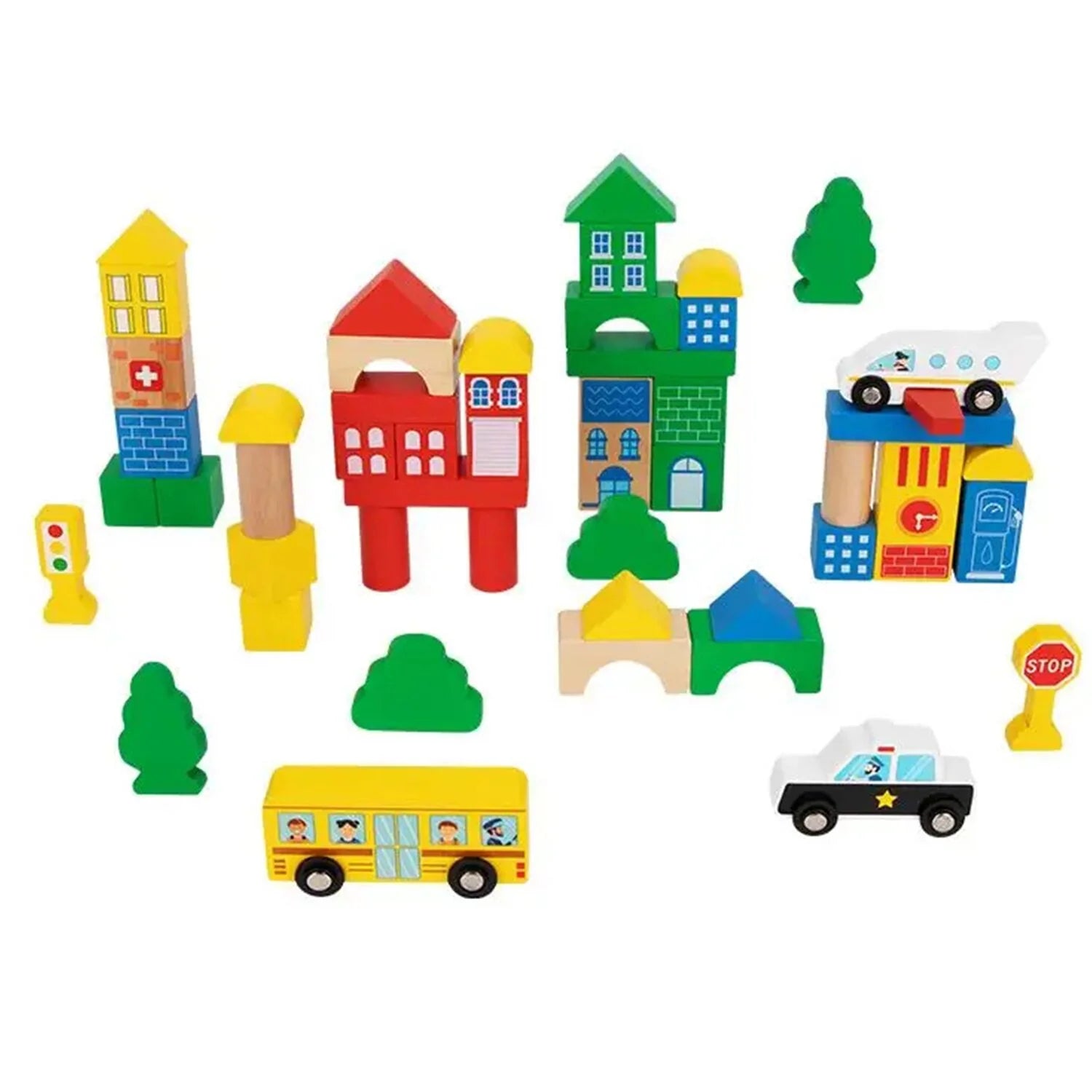 "Learning & Developmental Activity & Educational Preschool Toys - City Block Endless designs with these colourful wooden blocks. Blocks help children recognise different shapes and colours. It inspires creativity in young children. This set comes with wooden cars. Beautifully finished wooden blocks and painted with non-toxic paint. Suitable for children from the age of 24+ months Content: Wooden Car x 3, Wooden Station x 2, Wooden Block x 45"