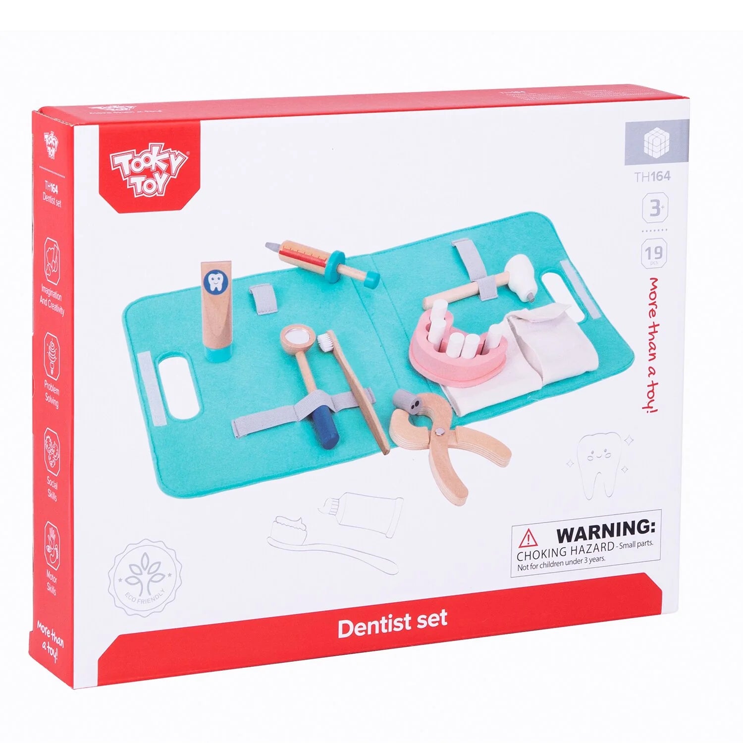 "Learning & Developmental Activity & Educational Preschool Toys - Little Dentist Set Play Set Get your aspiring dentists all set up with their first dental kit with Tooky Toy's wooden dentist set! With 18 pieces to play with boredom will be a thing of the past! The dentist set comes with everything you need to be a dentist including the teeth! This set is easily stored in a foldable dentist bag that Velcro's closed and fits nicely under the bed or in a toy box! Age Recommendation: 3 Years + Content: Bag x 1, Accessories x 18"