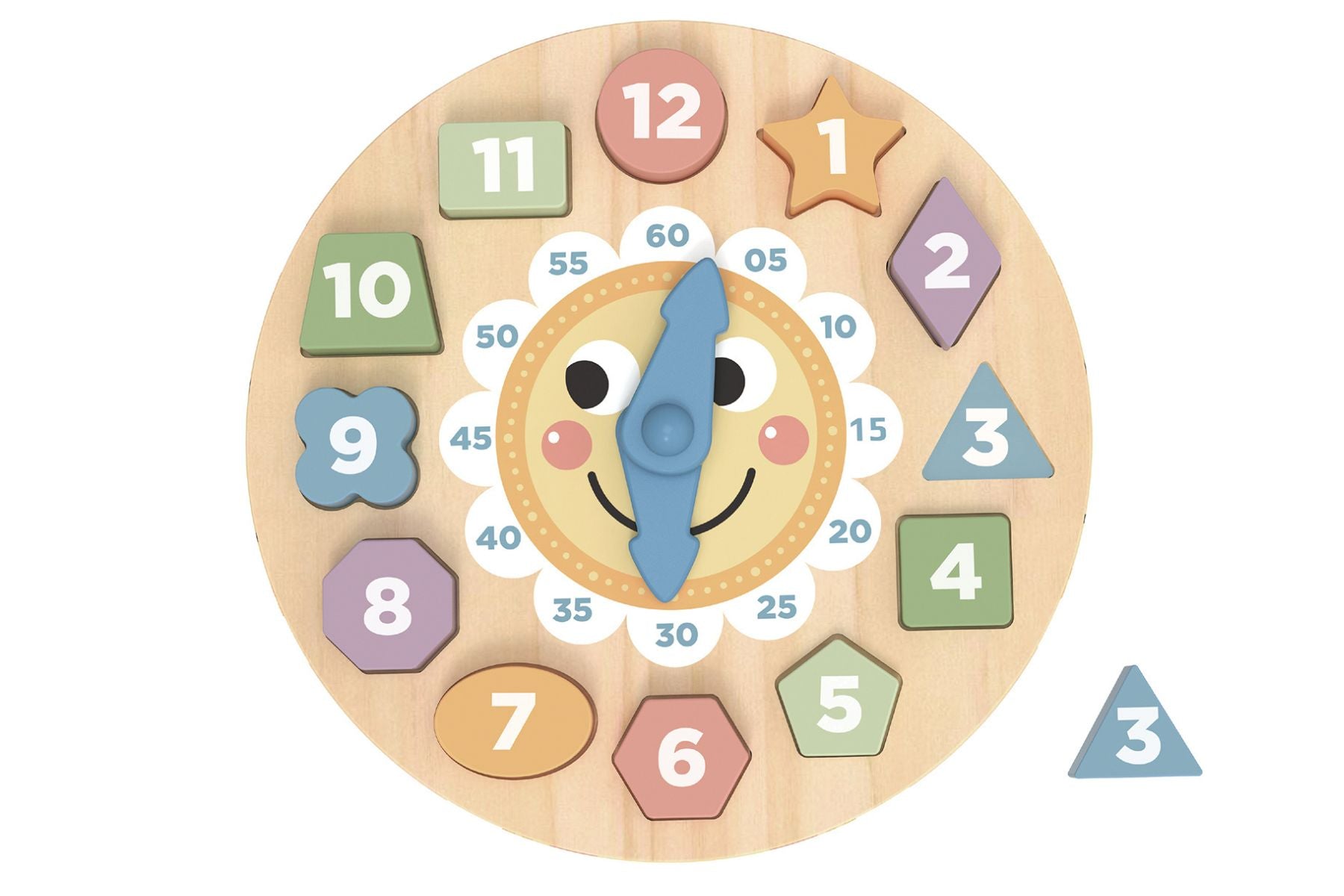 Immerse your child in a world of vibrant learning with the Forest Friends Wooden Clock and Shape Sorter from Tooky Toy. This delightful Sunny Faced style clock not only adds a pop of colour to any playroom but also serves as an invaluable educational tool, seamlessly blending fun and learning. With its captivating design and vivid hues, this wooden clock puzzle engages young minds in an interactive exploration of time and shapes. The clock features 12 wooden shapes that snugly fit into matching slots, encouraging children to practice shape recognition and fine motor skills as they manipulate the pieces. Meanwhile, the movable hands and prominent 5 minute groupings facilitate a deeper understanding of time concepts, laying a solid foundation for future learning. Crafted from high quality FSC certified timber, this clock ensures both sustainability and durability, reflecting Tooky Toys commitment to eco-conscious practices. Adorned with child safe, non toxic paint, parents can rest assured that their childs playtime is not only educational but also safe and environmentally friendly. Whether used as a standalone toy or as part of a structured learning activity, this versatile product offers endless opportunities for imaginative play and skill development, making it an essential addition to any child's developmental journey.