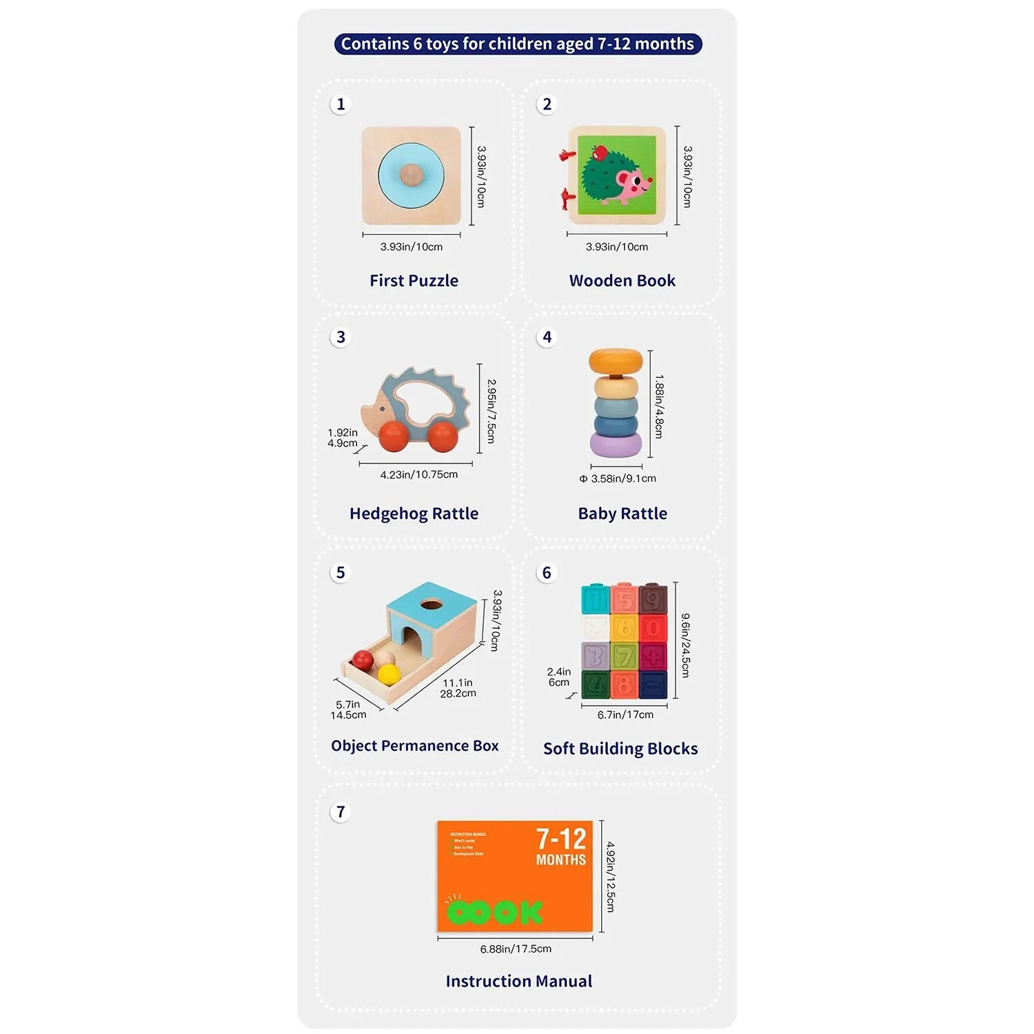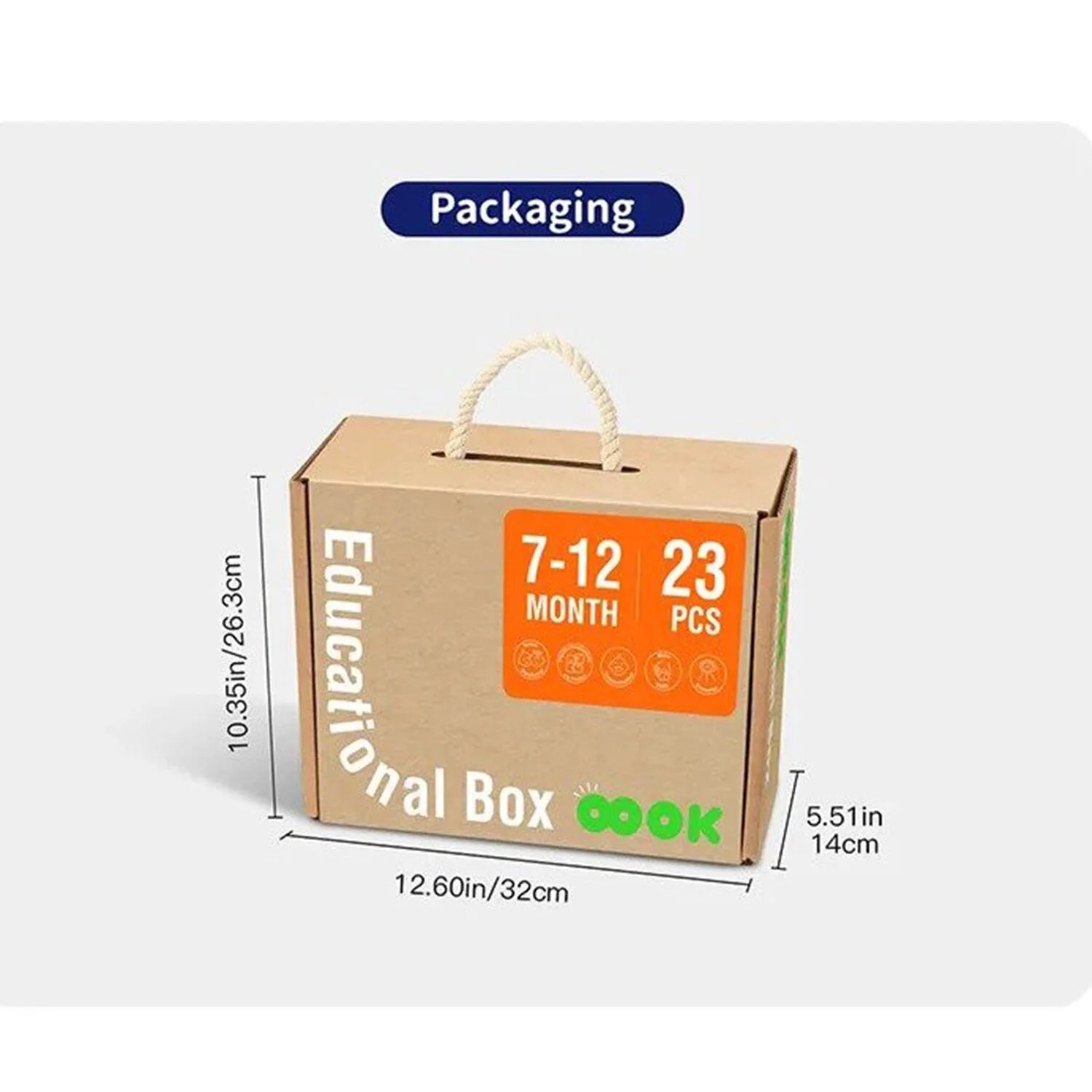 "Baby Sensory Educational Learning Toys - 7-12m Educational Box First years are all about learning and adapting. Support your baby development with our educational learning toys. At this stage, your child goes from sitting, crawling to standing and even walking on their own! They will enjoy exploring the world. And these toys are one of the best tools. Content: Wooden Book x1, Rubber x 12, Ball x 3, Other Accessories x 7"