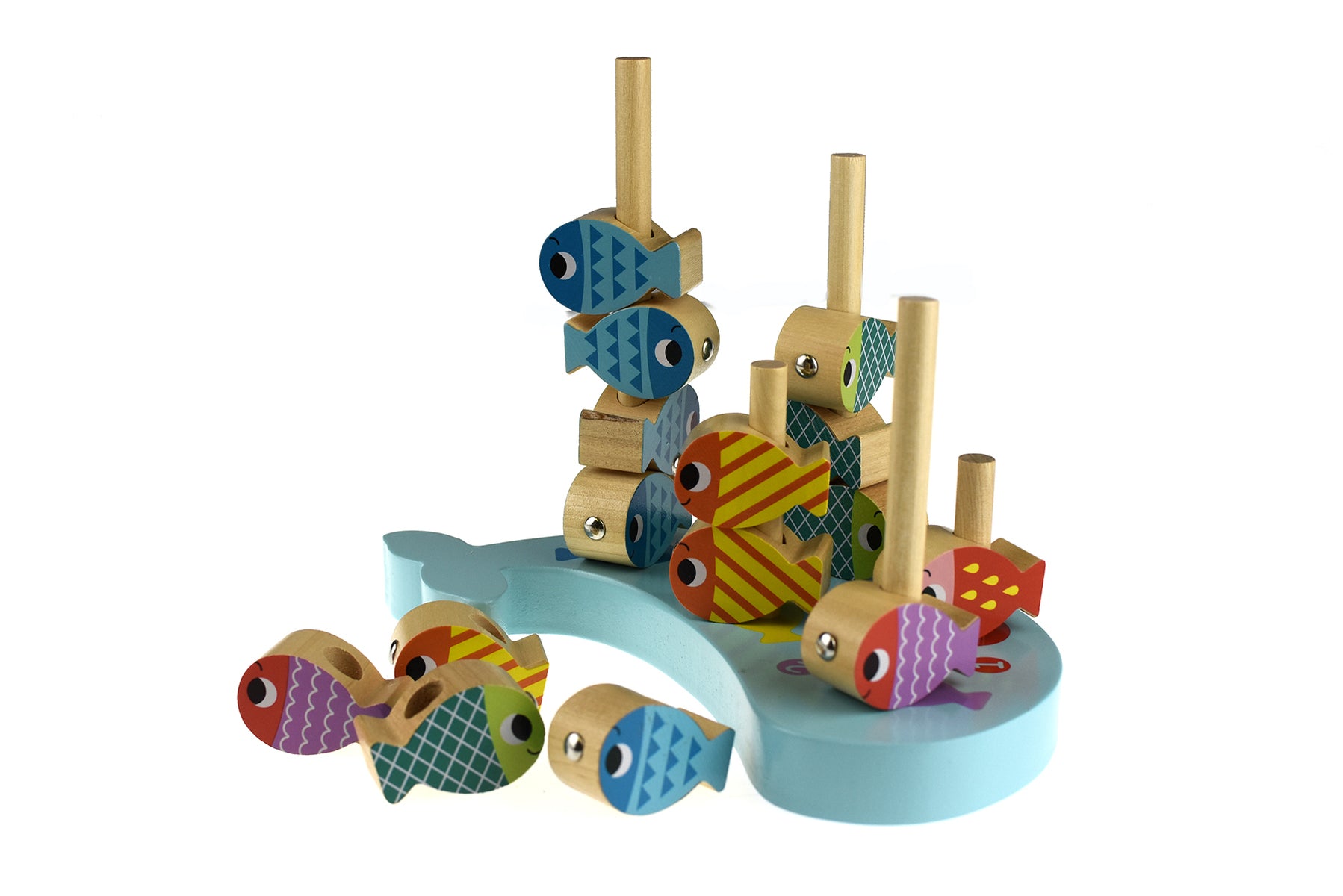 The classic fishing game has just been improved! We've added another level of play to the traditional magnetic game and have combined it with a stacking balancing game, a stacking number counting game and a threading set all in one!