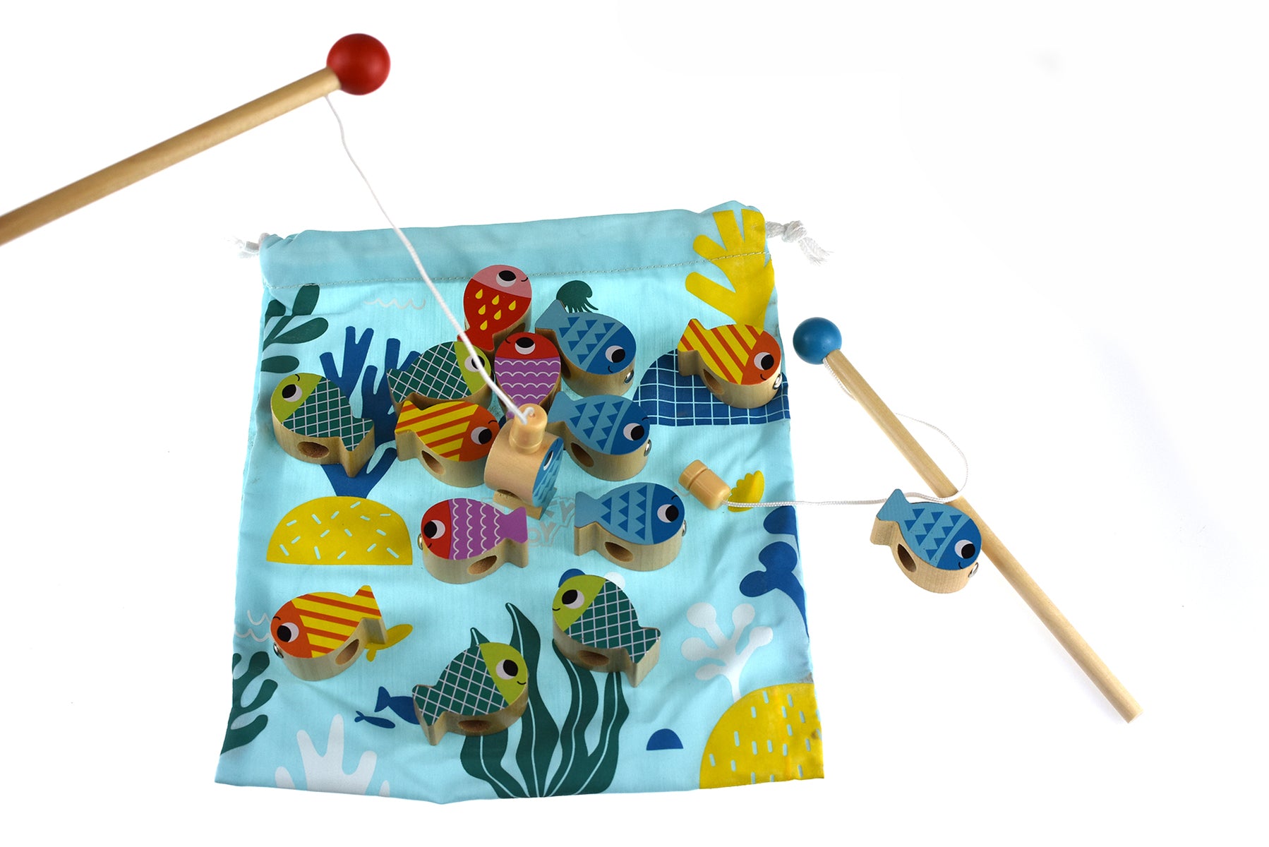 Each game comes with two rods, 13 magnetic fish, 4 removable stacking rods , 1 wooden needle and thread, a stacking whale and a fabric drawstring bag which can be used as the fishpond and to contain all the pieces once the game is completed.