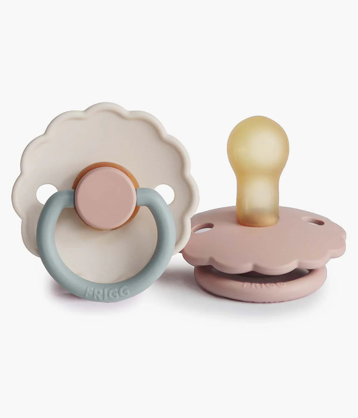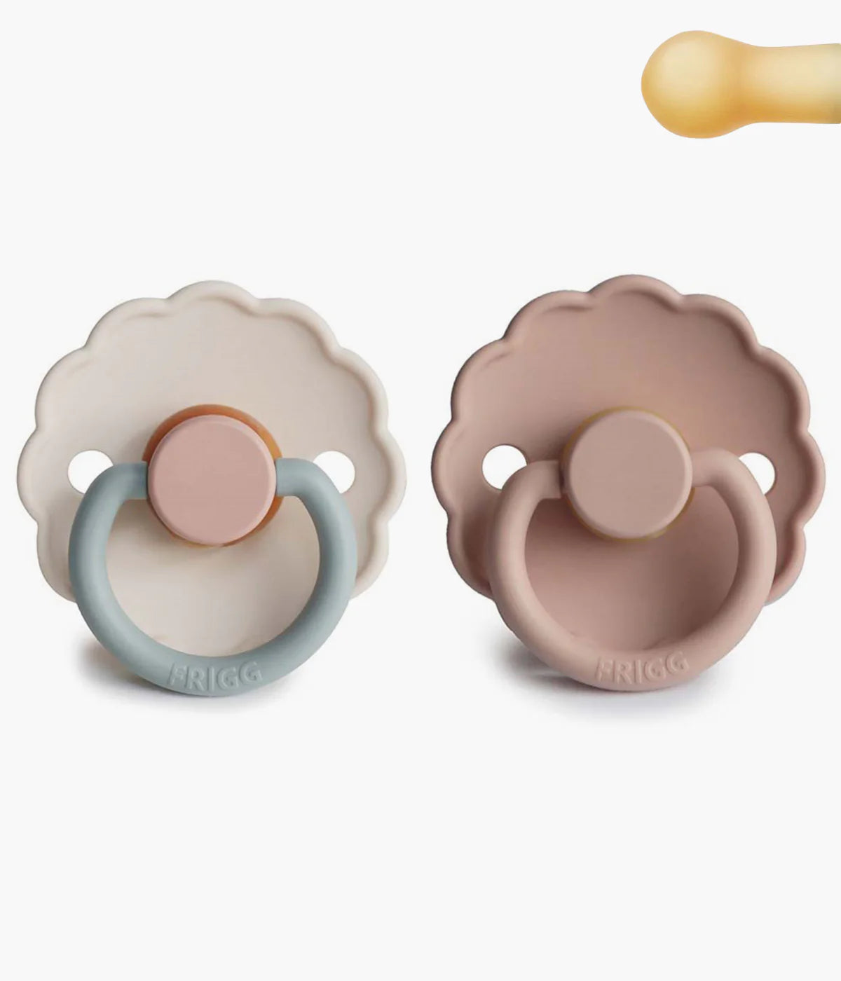 Pack de 2 chupetas Frigg Daisy de design inspirado nas pétalas de uma flor. Conjunto composto por 1 chupeta rosa (blush) e 1 pérola (cotton candy) com tetina redonda em borracha natural (látex), imitando a forma do peito materno, proporcionando ao bebé uma experiência de sucção natural e reconfortante.