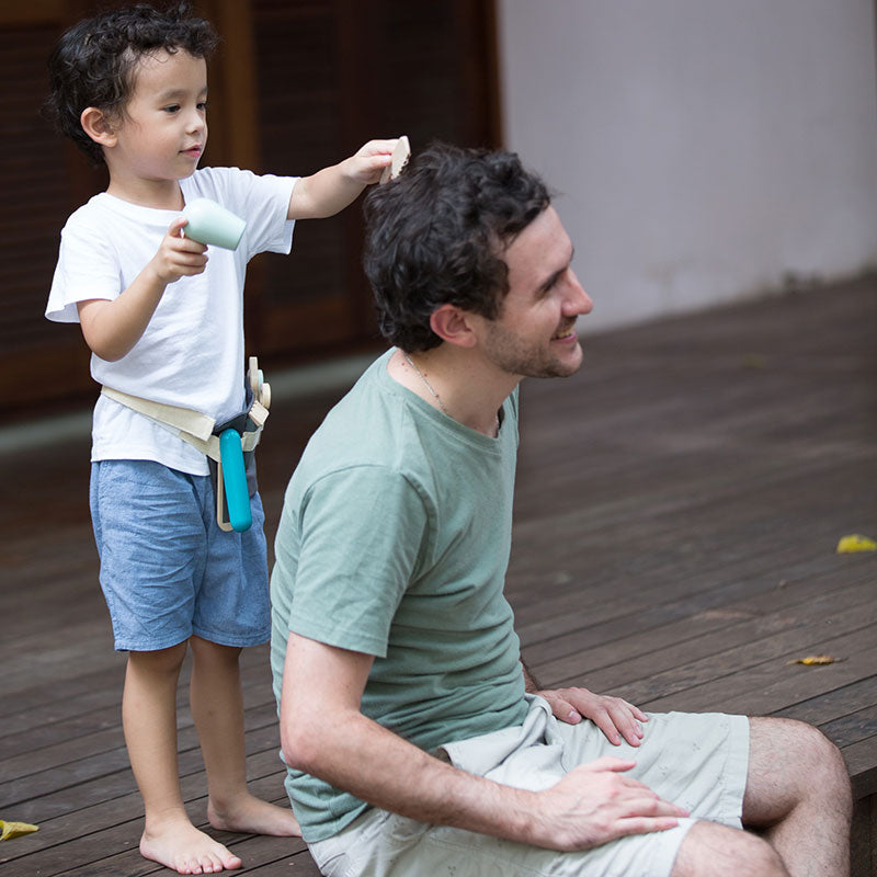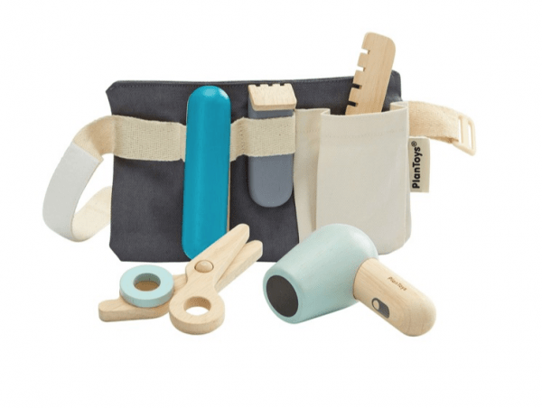 Your little hairdresser or barber will love this Hair Dresser Set from Plan Toys. This 6 piece set has everything your child needs to become a hairstylist. Use the hairdryer to dry the hair before straightening & use the scissors or clippers to cut their hair. All of their tools can be perfectly stored in their adjustable waist bag. Perfect for the development of fine motor skills, social skills, imagination & more.