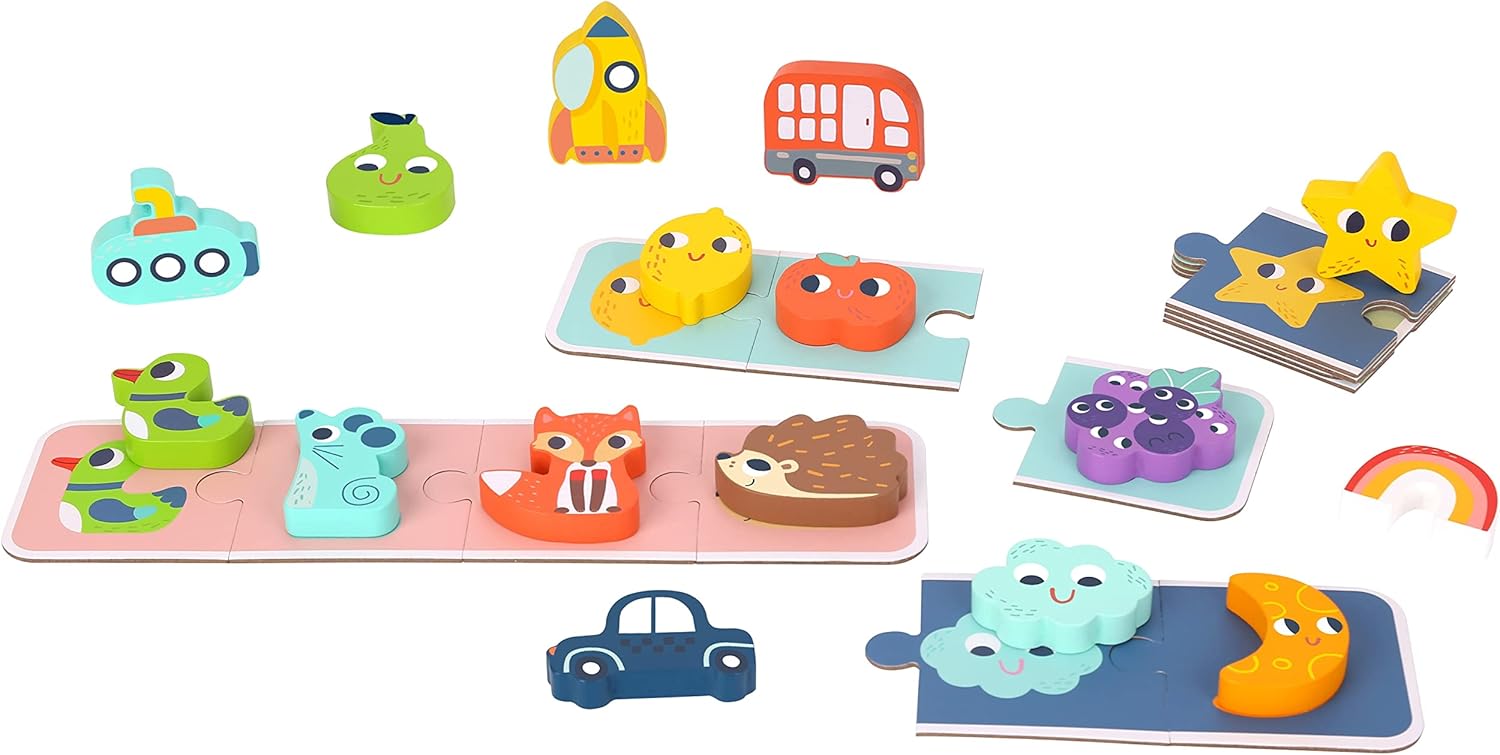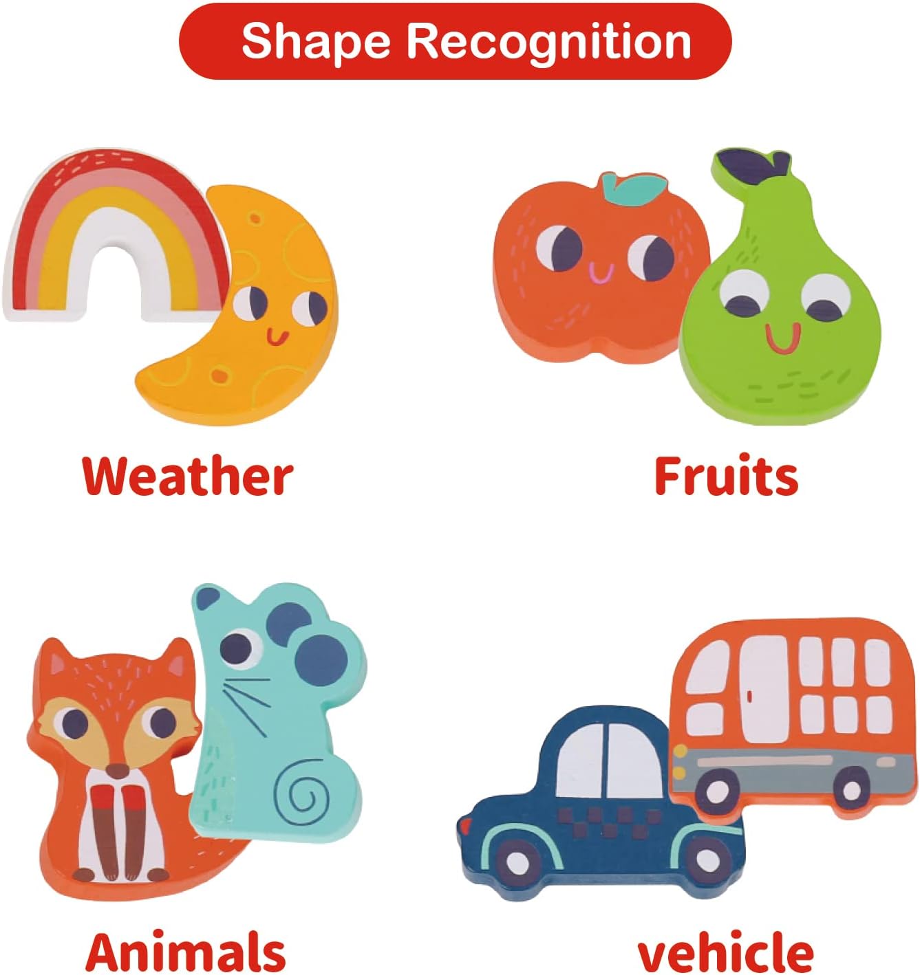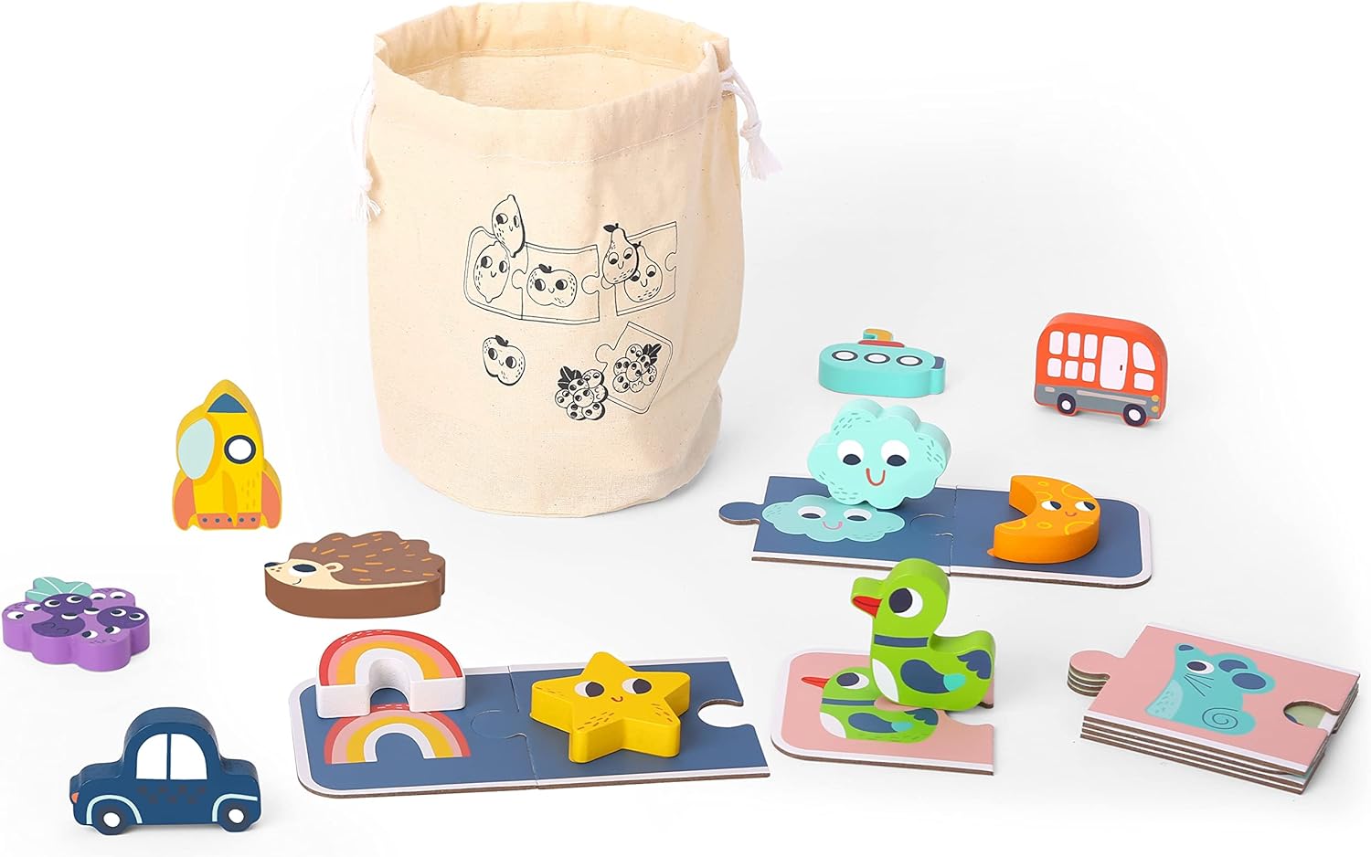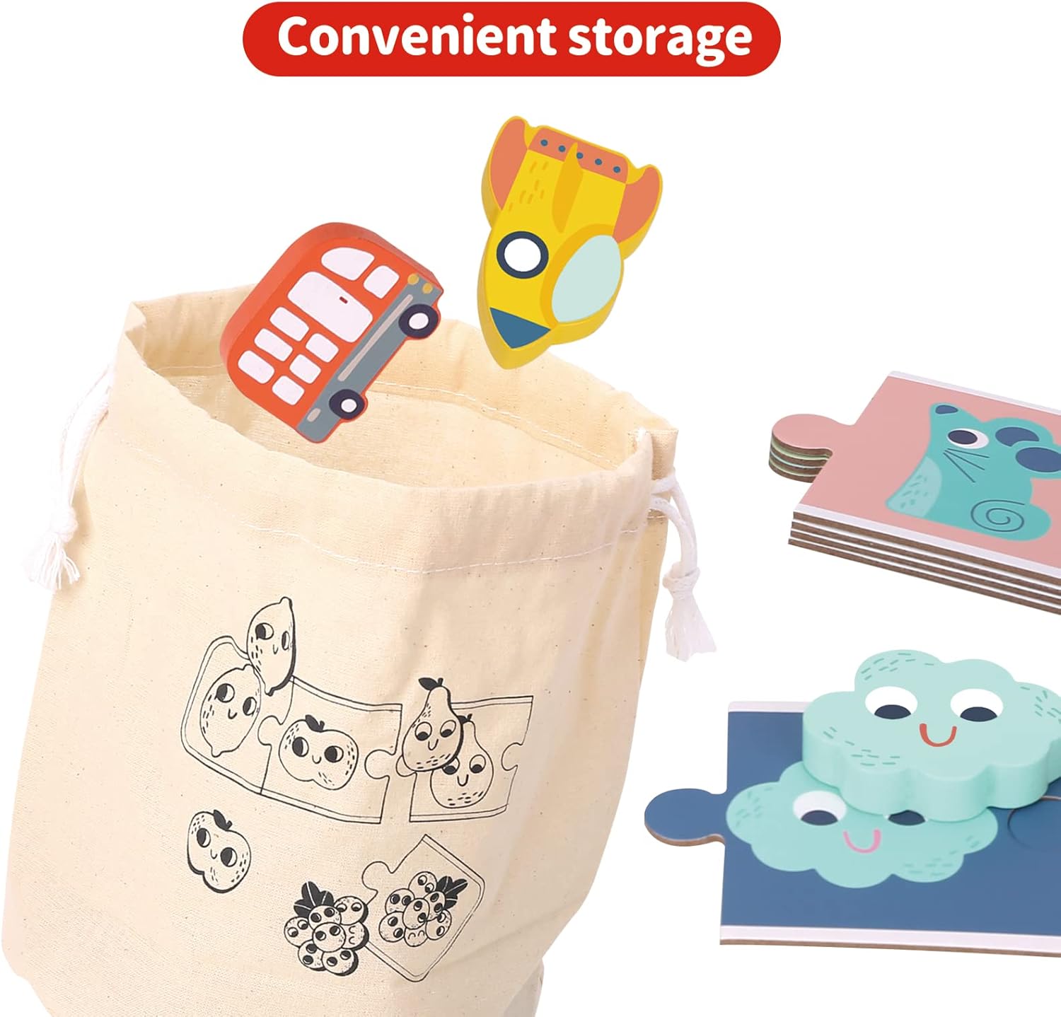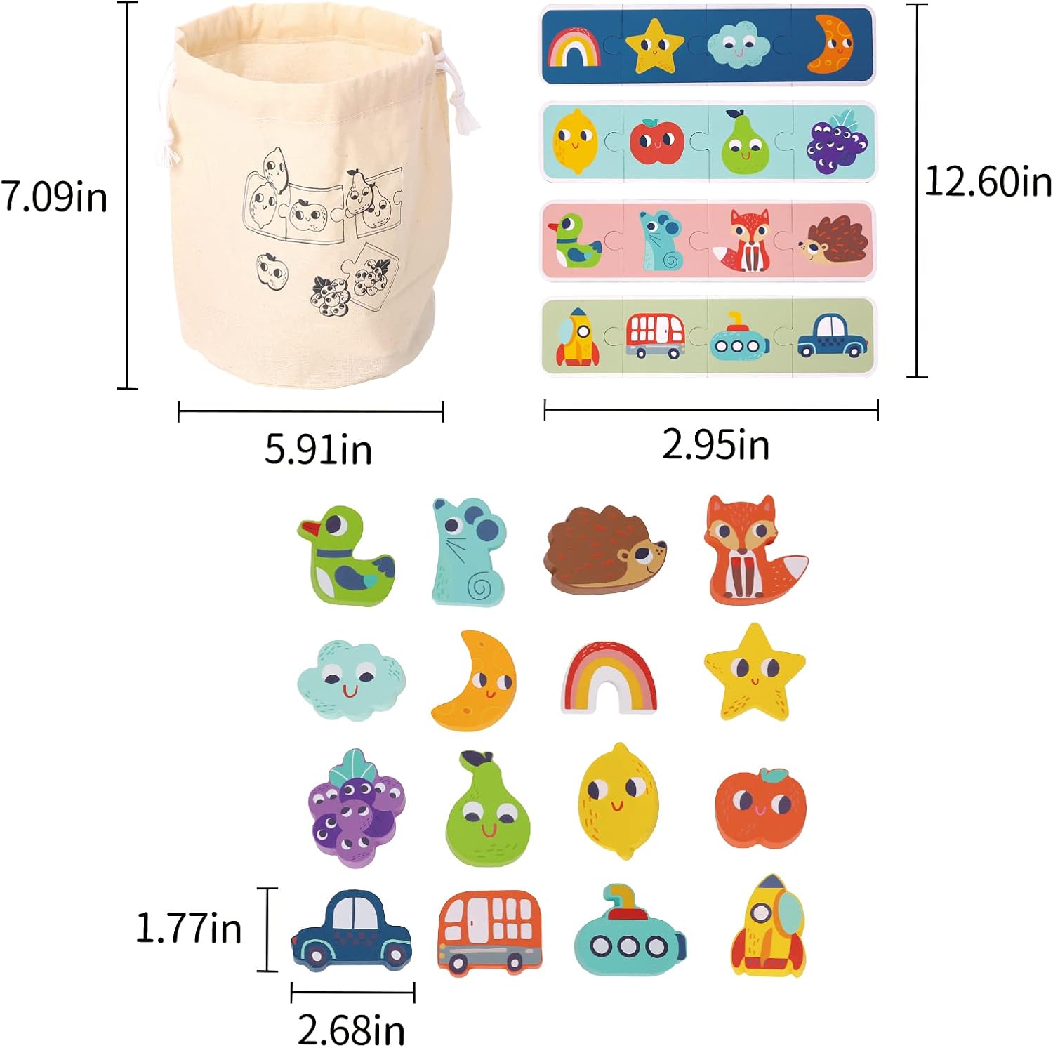 - Includes 16 wooden pieces, 16 puzzle cards and a fabric bag, for children 3 years old and older