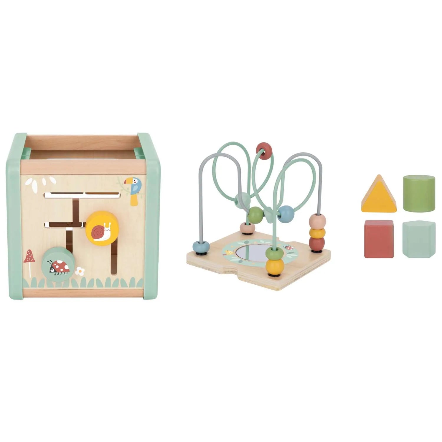 Brinquedo multifuncional ideal para crianças, pois possui 5 lados diferentes de atividades: labirinto para habilidades motoras finas, engrenagens, aramado, espaços para encaixar as formas geométricas e muito mais.