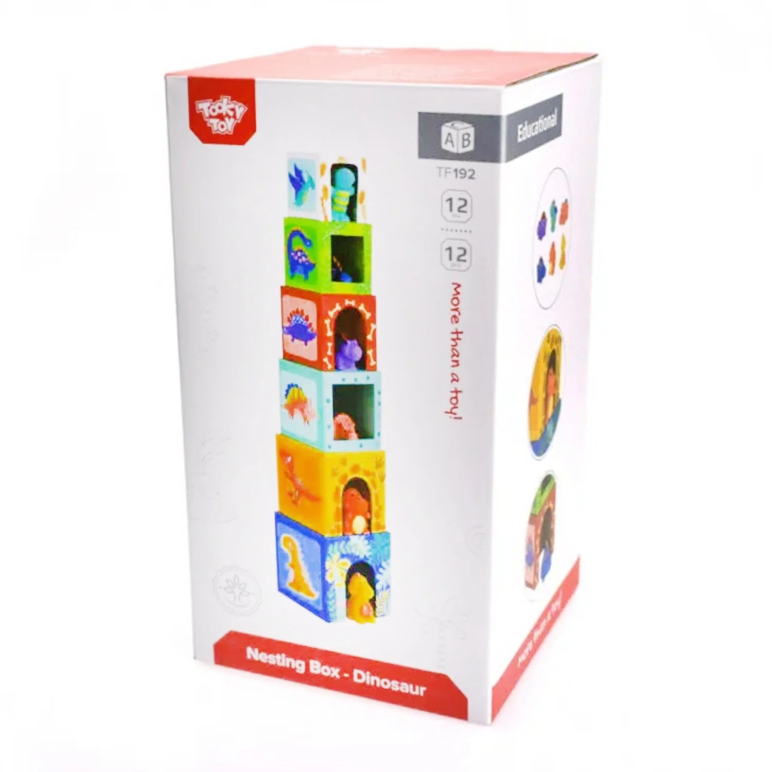 "Learning & Developmental Activity & Educational Preschool Toys - Dinosaur Nesting Boxes These fabulous nesting and stacking blocks from Tooky Toys are perfect for any playroom. Featuring brightly coloured illustrated dinosaurs on all blocks, the cubes are made with premium, high grade cardboard and features a wipe clean surface. These nesting blocks are made even more fun by featuring different shaped cut outs on each block, giving children even more ways to play with the blocks, whether they are houses, towers, caves and more. Each set of stacking blocks comes with 6 stacking blocks and 6 assorted squishy dinosaurs. These cubes can be stacked inside each other for easy packing up when not in use. Suitable for children aged 12m+ Content: Wooden Box x 6, Dinosaur x 6"