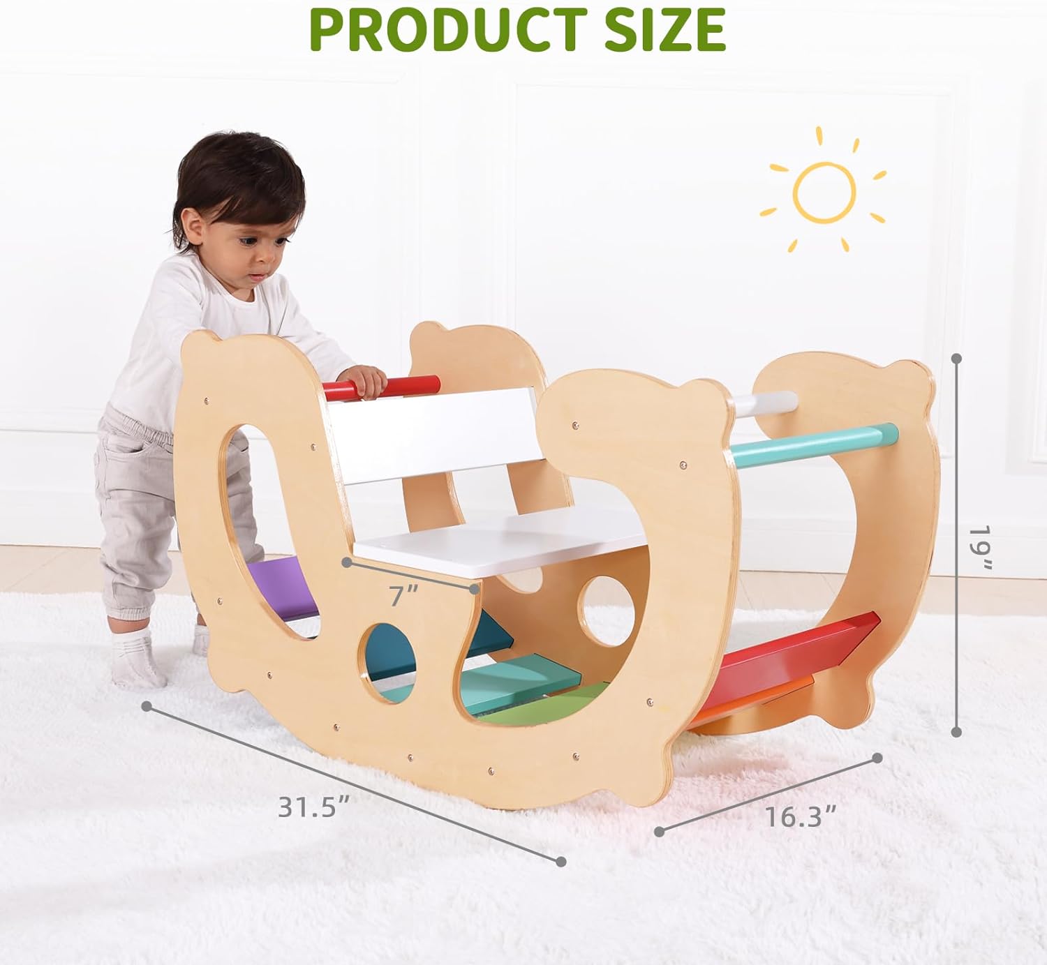 - VERSATILITY - Due to its versatility, toddler wooden rocker allows children to build their own imaginative play scenarios. It can be used as a rocking horse, a shop stand and as a montessori climbing set frame for kids.