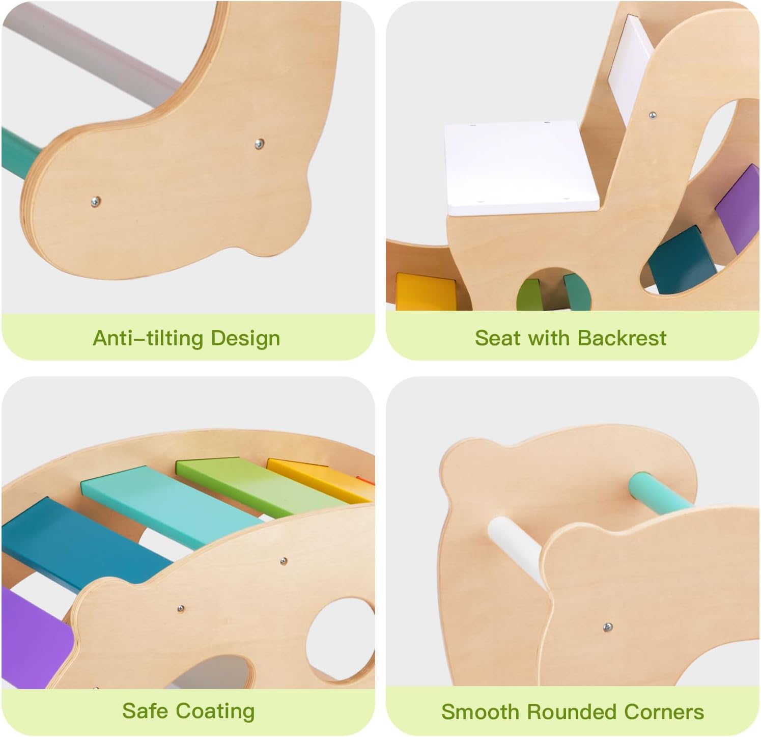 - RAINBOW ROCKER - With 7 rainbow colored smooth wooden boards and 2 white rocking horse smooth wooden boards, our rainbow rocker really looks amazing. Water-based paint meets all US safety standards.