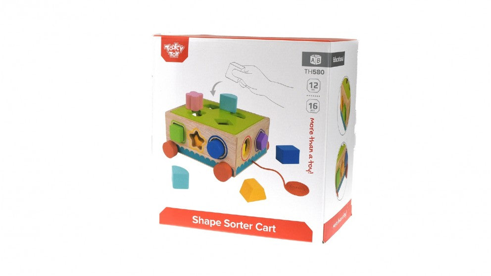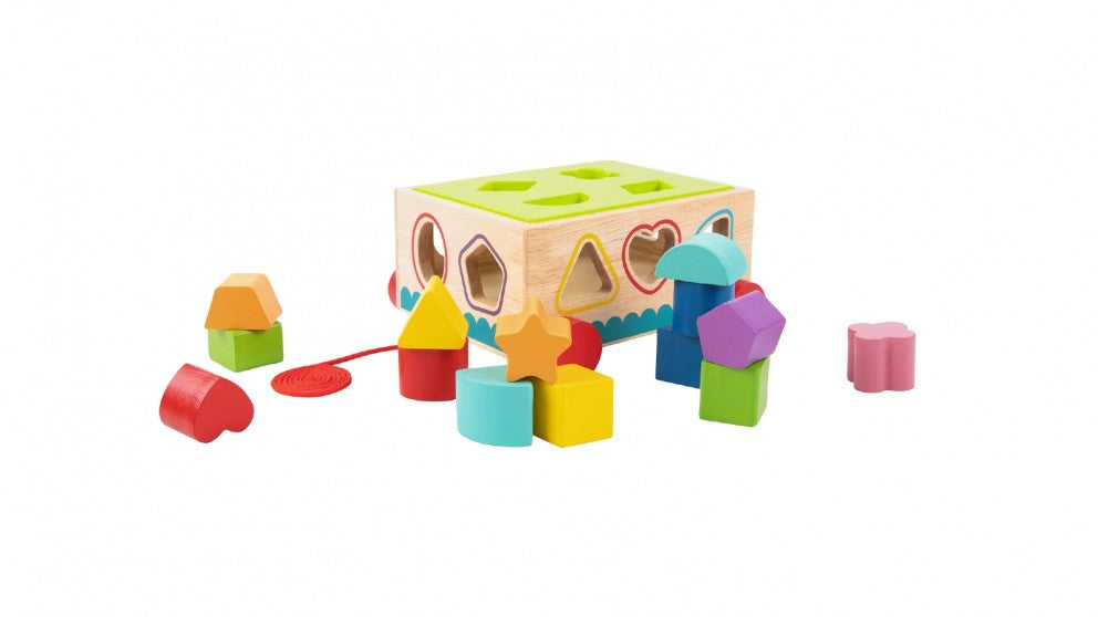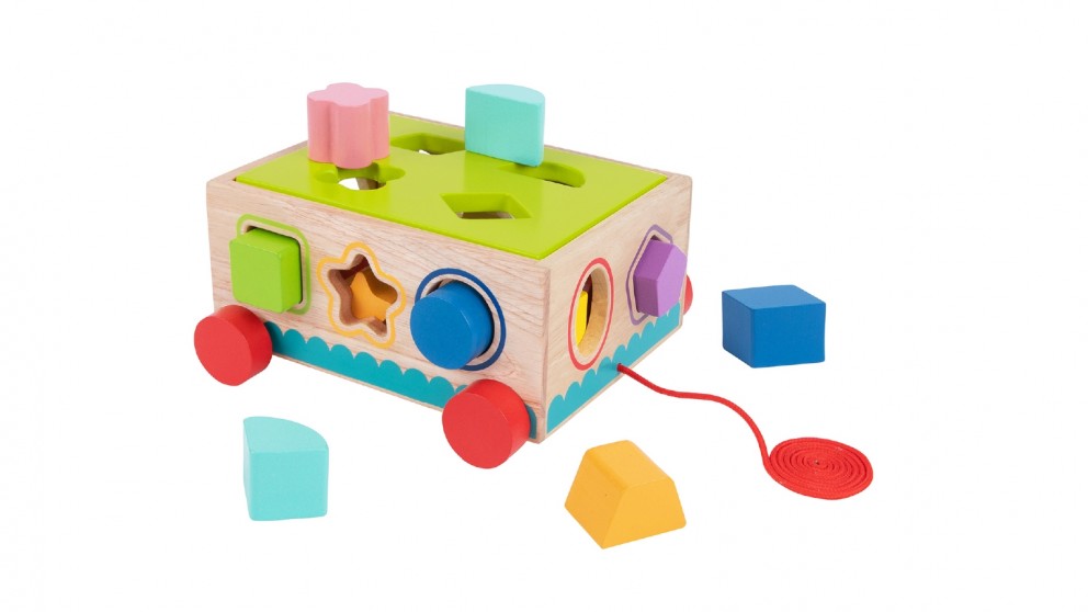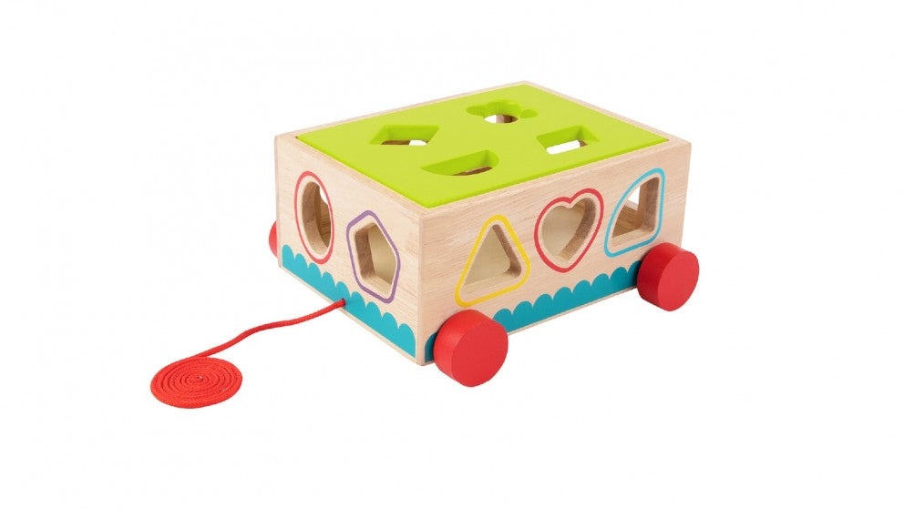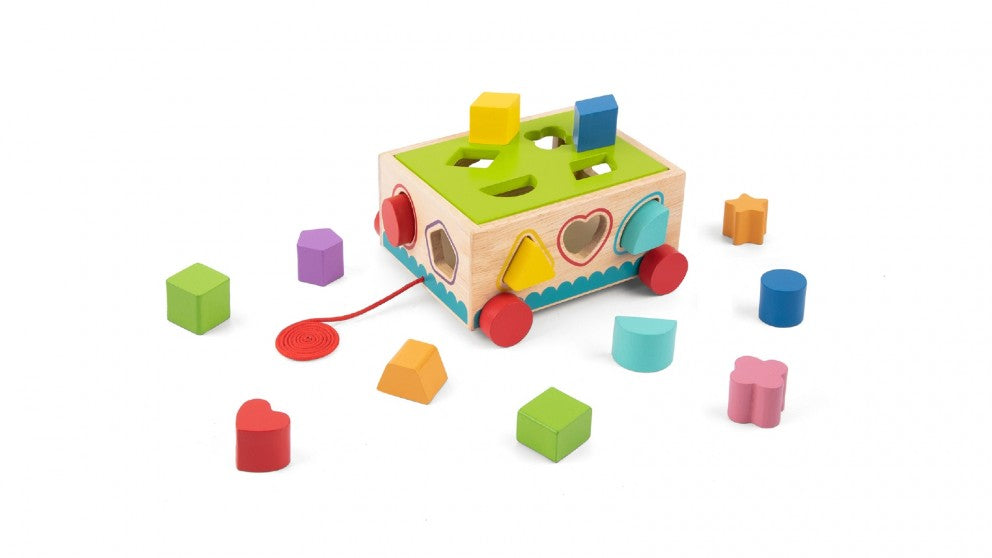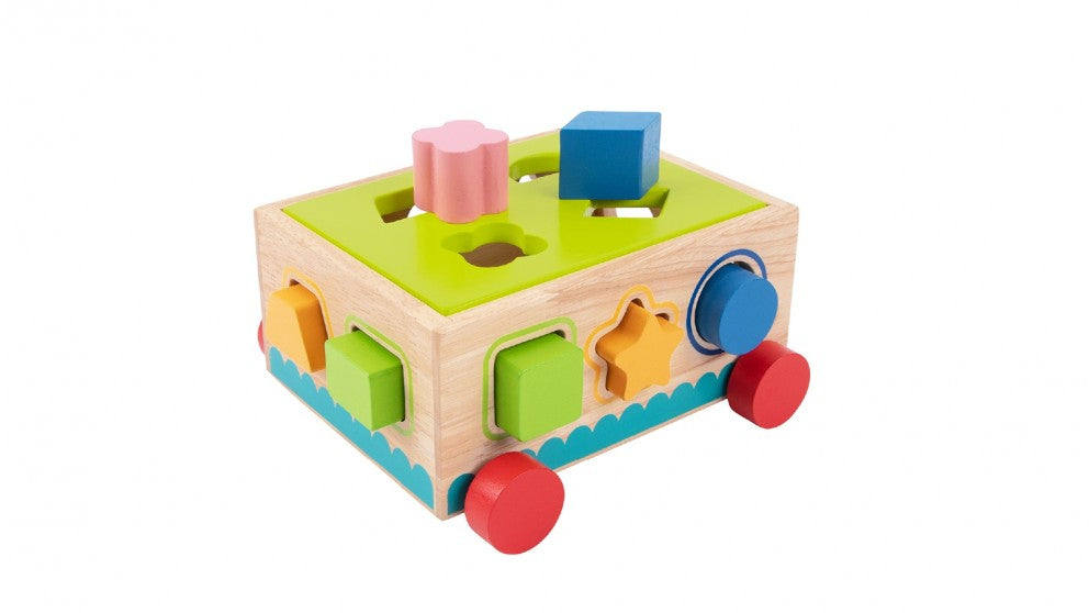 Keep your child entertained for hours as they explore various shapes and colours with the Tooky Toy Shape Sorter Cart.
